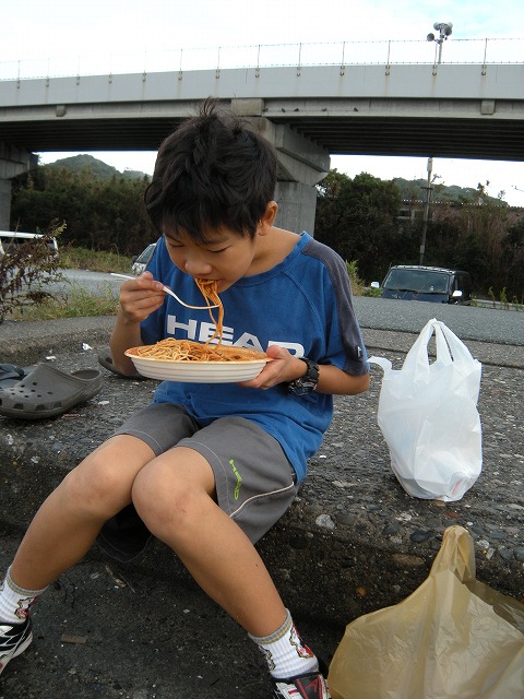 潮見坂手前にて朝食