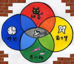 みなさん、むし歯は4つの要因からできている事をご存知ですか?右図のような4つの要因が重なる事によってむし歯が発生します。それぞれの要因を1つでも確実に抑制することができればむし歯を予防する事ができるでしょう。しかし、生活をしていくうえでそれぞれを確実に予防するという事は困難な場合が多いのでむし歯が進行しないよう防止していくことが大切です。食べたらすぐ磨く事やブラッシングをしっかり行なうことなどさまざまな方法がありますがその1つに「フッ素塗布」があります。みなさんはたびたび歯医者さんなどでフッ素を塗る機会があると思います。ここでは、その「フッ素」についてのお話をしていきたいと思います。フッ素は、体を構成する物質の1つなので体にとってとても必要なものです。また、むしば菌の働きを弱め、酸を作りむし歯になるのを防ぐ働きをします。フッ素には2種類の取り入れ方があります。1つは直接体内へ取り入れる場合です。日頃食べている魚介類、海草、野菜(根菜類)、お茶などの食品から体内に吸収し、骨や歯に蓄積されていきます。もう1つは、歯医者などで歯に直接塗ったり歯磨剤に入っている成分から取り入れる場合です。フッ素は主に、萌出して間もないむし歯になっていない歯が適応歯です。フッ素が多く取り込まれるからです。数年経過した歯にフッ素塗布しても効果がないわけではないので成人の方にも塗っていただけます。こちらの当医院では子供さんには年に4回、成人の方には年に2回の定期検診でのフッ素塗布を取り入れています。フッ素の中毒となる量は歯科医院で使用する量や、歯磨剤で使用する量とは比較にならないほどおおきな数字ですのでご安心下さい。