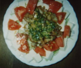5、皿にサラダ菜を敷き3の豆腐とプチトマトを皿に盛り、2の豚肉をのせて、4のドレッシングをかける。